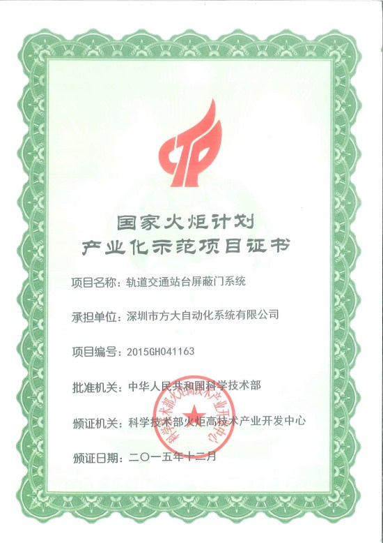 國家火炬計劃產業化示范項目是要求屬于國家鼓勵發展的重點振興產業和戰略性新興產業領域,是對“轉方式、調結構”及地方產業優化升級有帶動和示范效應的高新技術項目,有自主知識產權、推動產學研結合的科技成果產業化項目。方大集團“軌道交通站臺屏蔽門系統”被列入“國家火炬計劃產業化示范項目”標志著公司在自主知識產權、科技創新能力方面位列國內企業前列,是國家科學技術部對公司科技創新實力的認可。