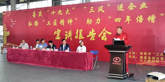 10月19日下午,由南昌市“三風辦”主辦的“喜慶十九大,‘三風’進企業”·弘揚“工匠精神”,助力“四年倍增”宣講報告會走進方大集團全資子公司方大新材料(江西)有限公司(簡稱:江西新材,下同)。南昌市政協副主席萬敏率政協委員一行出席活動,南昌市政協委員、江西新材董事長熊建偉、江西新材總經理黃敬、江西置地總經理李軍陪同出席。