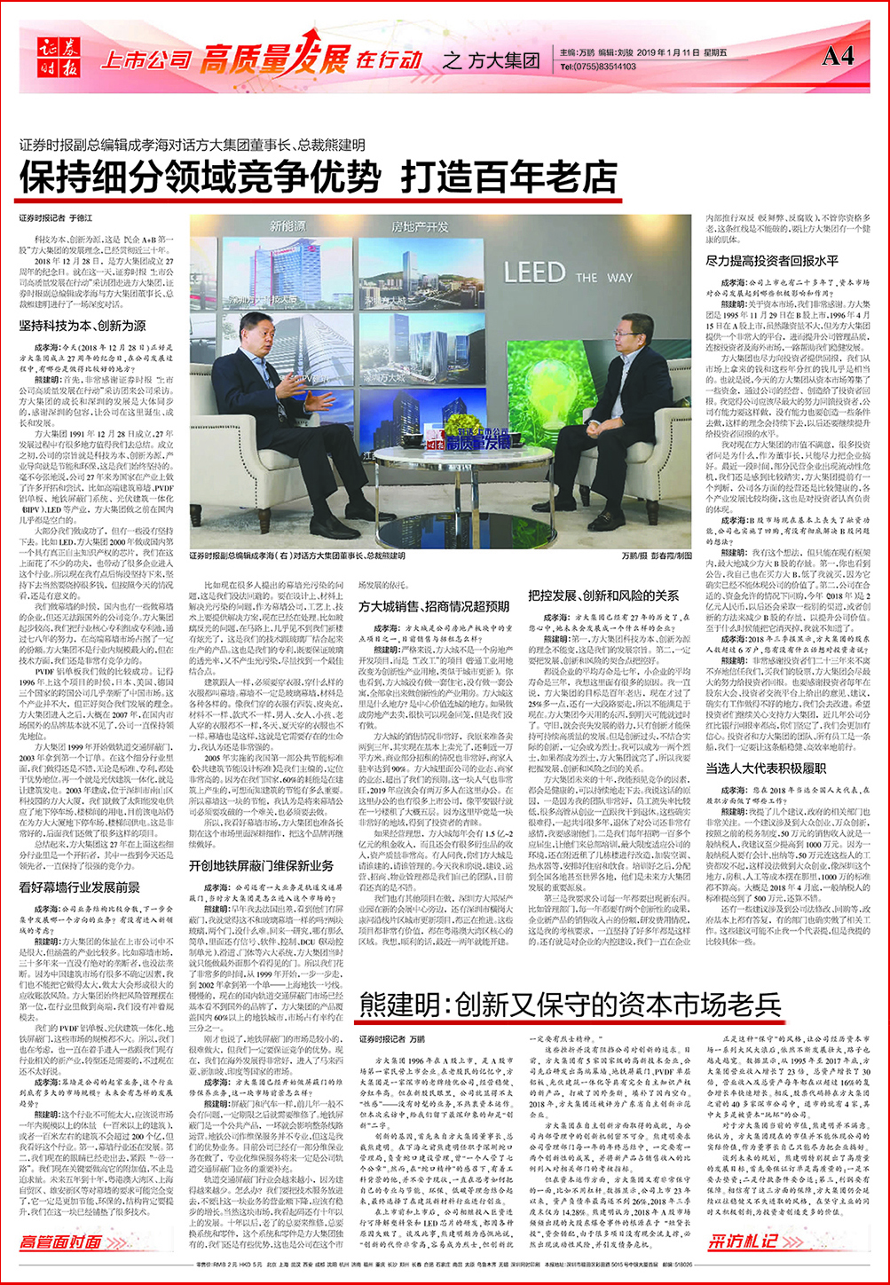 熊建明:首先,非常感謝證券時(shí)報(bào)“上市公司高質(zhì)量發(fā)展在行動(dòng)”采訪團(tuán)來(lái)公司采訪。方大集團(tuán)的成長(zhǎng)和深圳的發(fā)展是大體同步的,感謝深圳的包容,讓公司在這里誕生、成長(zhǎng)和發(fā)展。