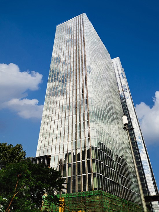 深圳·萬科濱海置地大廈位于深圳市福田區(qū),幕墻類型主要是鋸齒狀單元式玻璃+石材+穿孔鋁板幕墻。項目塔樓采用L型和I型單元板塊組成,面板采用蜂窩石材、中空夾膠玻璃和穿孔鋁板。為了增強幕墻系統(tǒng)的通風性能,在穿孔鋁板后側(cè)設(shè)置了內(nèi)開的鋁板窗。鋸齒狀的幕墻類型和特色材料的組合使該項目成為濱河大道上的一道靚麗風景,同時也給設(shè)計施工帶來了難題,項目團隊通過三維模擬確保L型板塊與I型板塊精確插接,對使用高度157m的蜂窩石材連接方案進行了加強措施,并順利通過幕墻專家專項的評審。