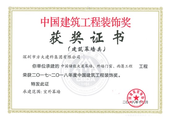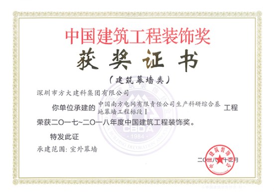 近日,中國建筑裝飾協會頒發了2017-2018年度中國建筑工程裝飾獎的獲獎證書,方大集團股份有限公司全資子公司深圳市方大建科集團有限公司承建的四項幕墻工程榮獲中國建筑工程裝飾獎——方大廣場(一期)、深業上城(南區)塔2、中國儲能大廈、中國南方電網有限責任公司生產科研綜合基地。