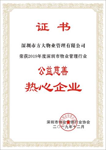 2019年度深圳市物業(yè)管理行業(yè)“優(yōu)秀企業(yè)”、“公益慈善熱心企業(yè)”評(píng)選由深圳市物業(yè)管理行業(yè)協(xié)會(huì)主辦,旨在鼓勵(lì)各物業(yè)管理企業(yè)積極開展扶貧、濟(jì)困捐助等公益活動(dòng),樹立模范典型,發(fā)揮榜樣示范作用,促進(jìn)物業(yè)管理水平的提高,同時(shí)帶動(dòng)更多的企業(yè)和從業(yè)人員,高質(zhì)量地推進(jìn)行業(yè)發(fā)展。此次榮獲“優(yōu)秀企業(yè)”、“公益慈善熱心企業(yè)”兩個(gè)獎(jiǎng)項(xiàng),表明對(duì)方大物業(yè)及公司公益慈善工作的肯定。