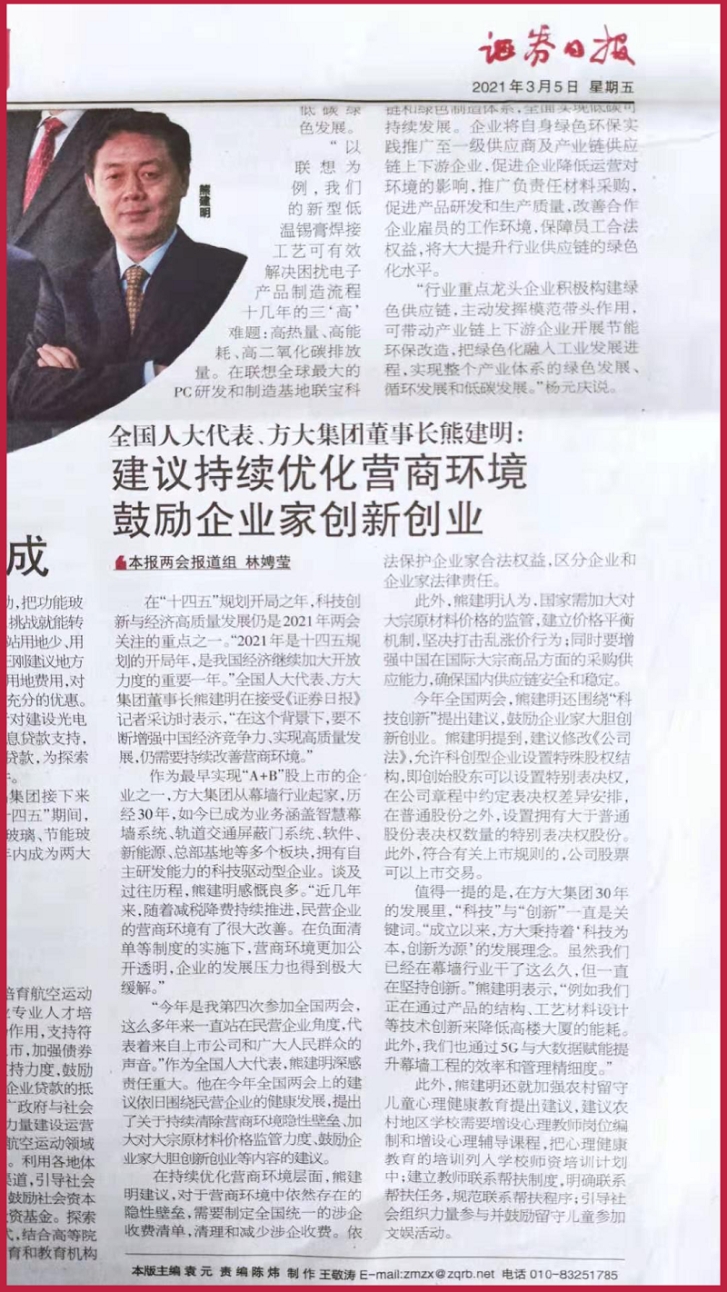 在“十四五”規(guī)劃開局之年,科技創(chuàng)新與經(jīng)濟(jì)高質(zhì)量發(fā)展仍是2021年兩會關(guān)注的重點之一。“2021年是十四五規(guī)劃的開局年,是我國經(jīng)濟(jì)繼續(xù)加大開放力度的重要一年。”全國人大代表、方大集團(tuán)董事長熊建明在接受《證券日報》記者采訪時表示,“在這個背景下,要不斷增強(qiáng)中國經(jīng)濟(jì)競爭力、實現(xiàn)高質(zhì)量發(fā)展,仍需要持續(xù)改善營商環(huán)境。”
